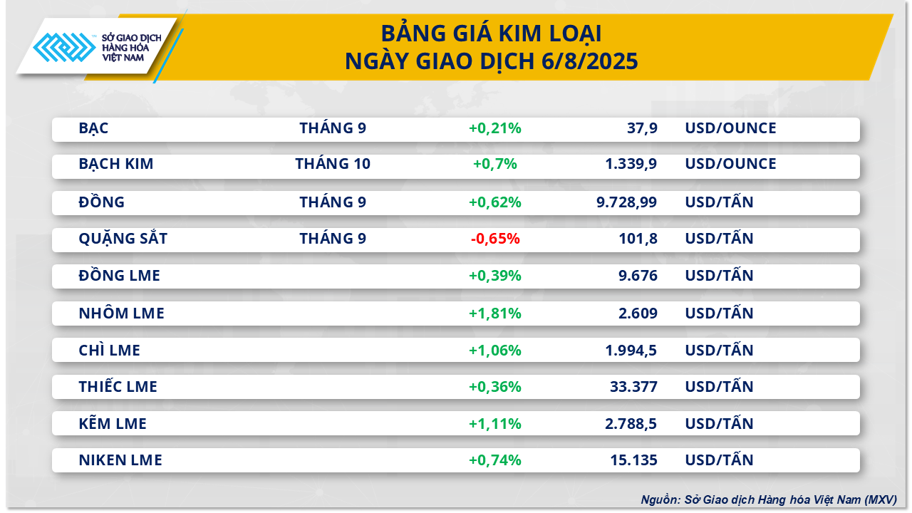 Khép lại phiên giao dich ngày hôm qua (7/8), sắc xanh bao phủ thị trường kim loại trong bối cảnh đồng USD suy yếu và tình trạng thiếu hụt nguồn cung kéo dài ở một số mặt hàng kim loại.